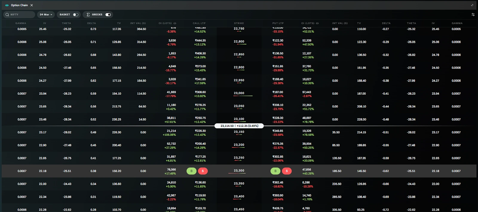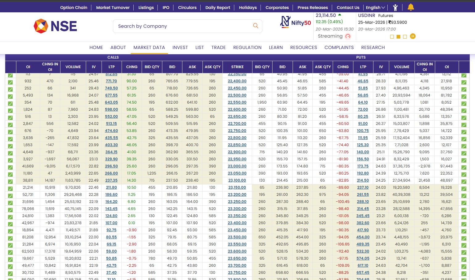 Nifty is trading at 23,114.50 on 22 Mar 2026. Here is the option chain: