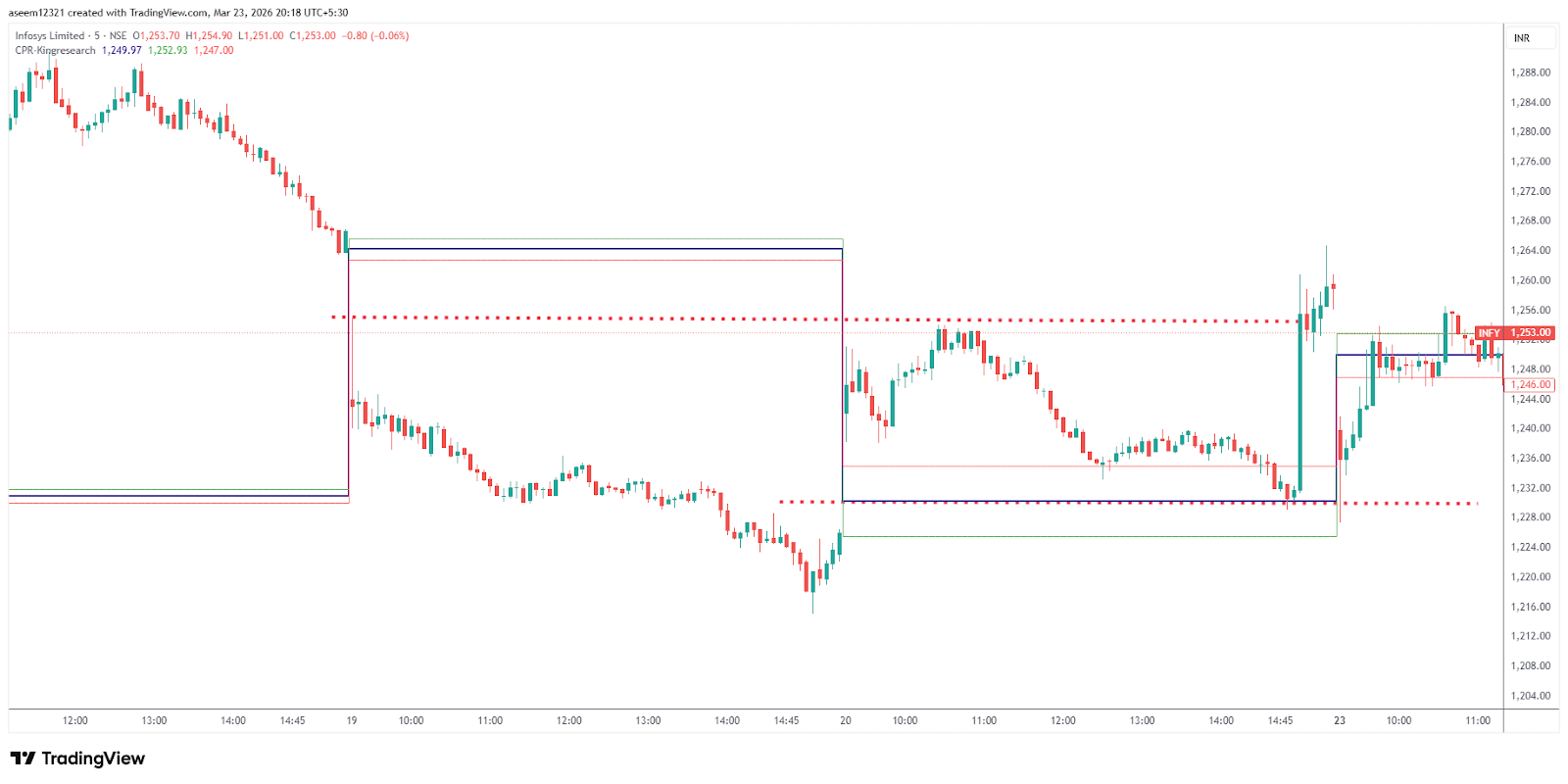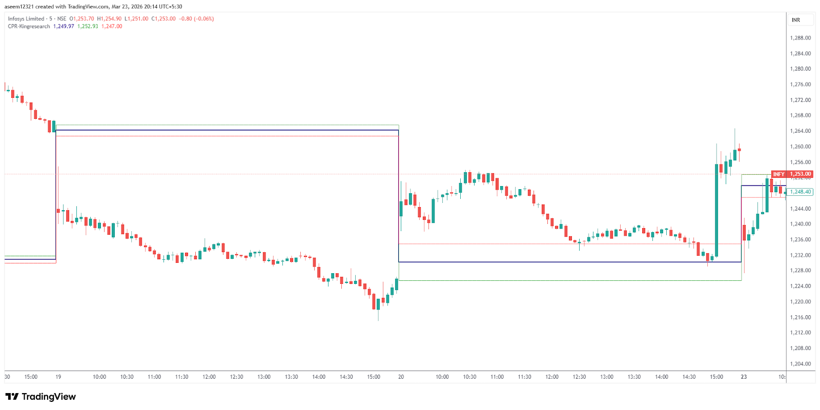 Again, we can see the Infosys chart. On 20th March, the CPR was fairly wide, and the market was expected to be sideways. That is exactly what happened. The trader could have marked key support and resistance levels and entered based on them. The important resistance zone was the previous day's high (1255). The market touched this level around 10:25, then fell. Since the pivot itself is an important zone, the market took support at the pivot (1229), and a buying opportunity came around 14:50