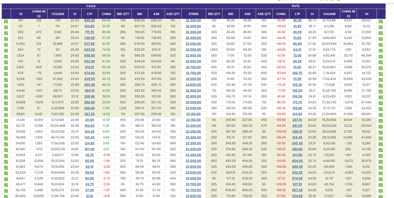 As the chart shows, the highest OI on the call side is 23,300 CE, and on the put side, it is 23,000 PE.