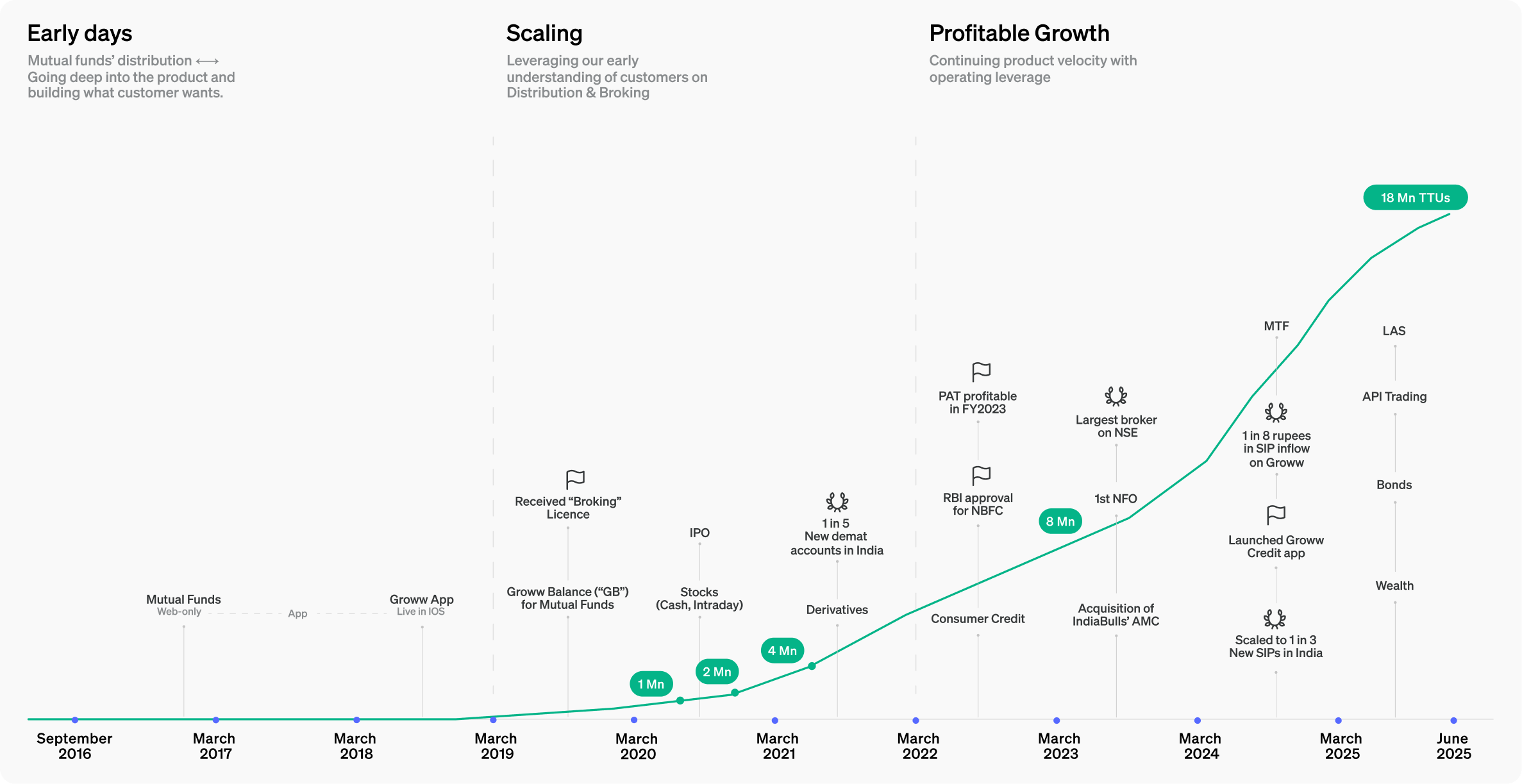 Total Transacting Users ("TTUs") is the sum total of unique new transacting users acquired as of the end of the reporting period on Groww platform whereby a 'New Transacting User' (“NTUs”) is a user who has (i) deposited or invested ₹1,000 or more and has undertaken a transaction on our platform, or (ii) has taken a loan on our platform for the first time.